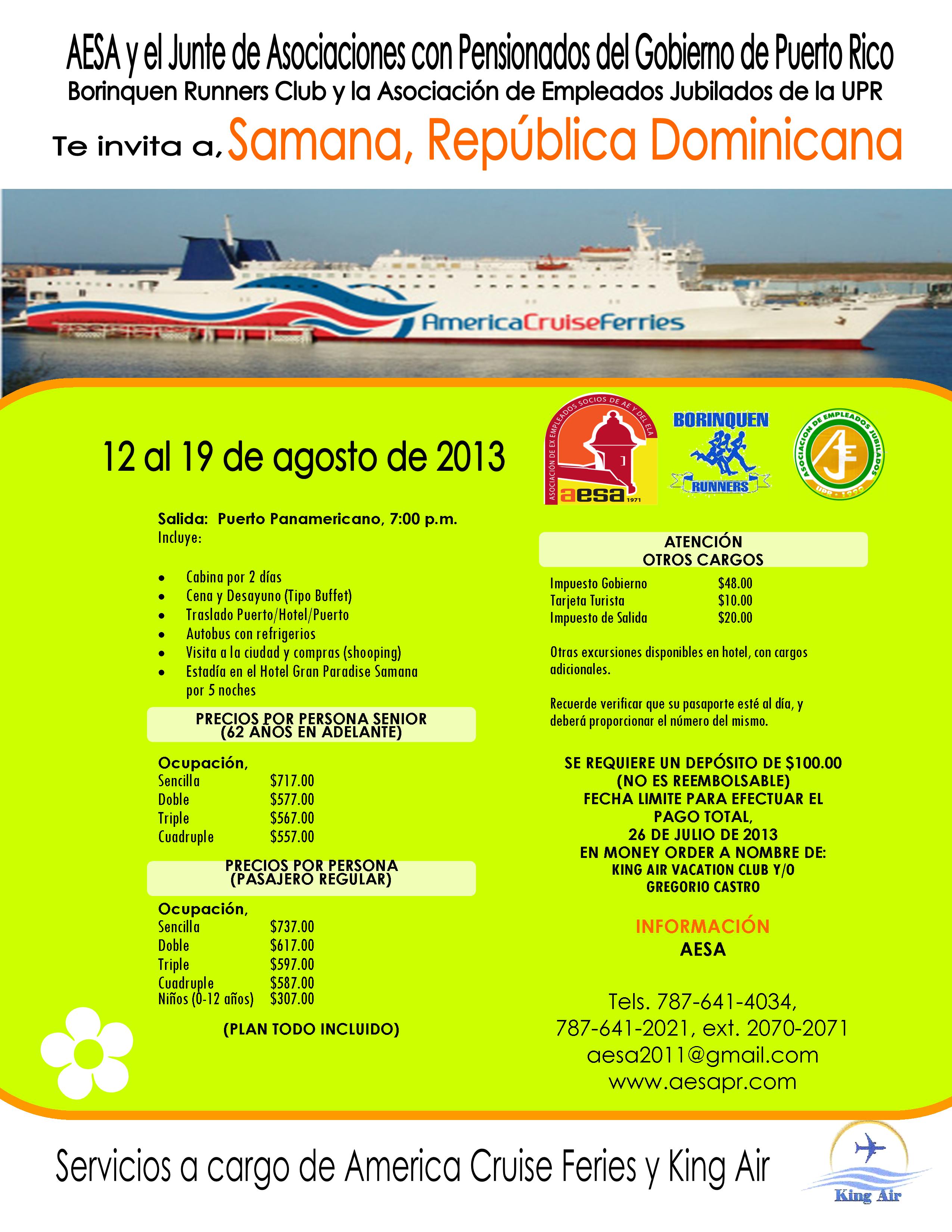 AESA se complace en invitarte a su primer Viaje Cultural a Samana, República Dominicana junto con la Asociación de Empleados Jubilados de la UPR, Borinquen Runners Club y el Junte de Asociaciones con Pensionados del Gobierno de P.R. El mismo se realizará del 12 al 19 de agosto de 2013. Para más detalles vea la hoja promocional o llame a nuestras oficinas al 787-810-4971, ext. 2071 (Arlene Marrero).