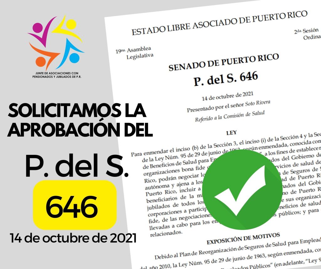 La Asociación Exempleados de Socios en Acción y el Junte de Asociaciones con Pensionados y Jubilados del Gobierno de Puerto Rico, APOYAN LA APROBACIÓN del Proyecto del Senado 646 del 14 de octubre de 2021 presentado por el Hon. Rubén Soto Rivera, presidente de la Comisión de Salud del Senado de Puerto Rico. Este proyecto tiene como propósito, enmendar la Ley 95 para incluír explícitamente a los pensionados de la Universidad de Puerto Rico en la Ley 117; y que puedan participar libre y voluntariamente de las cubiertas de la Alianza por la Salud del Pensionado. En adición, se solicita que se le conceda a la Alianza por la Salud del Pensionado la autonomía, para establecer el o los periodos de inscripción de los menores de 65 años. Reclamamos la aprobación de este proyecto para continuar mejorando las cubiertas y servicios a todos los pensionados de Puerto Rico, incluyendo los pensionados de la UPR.