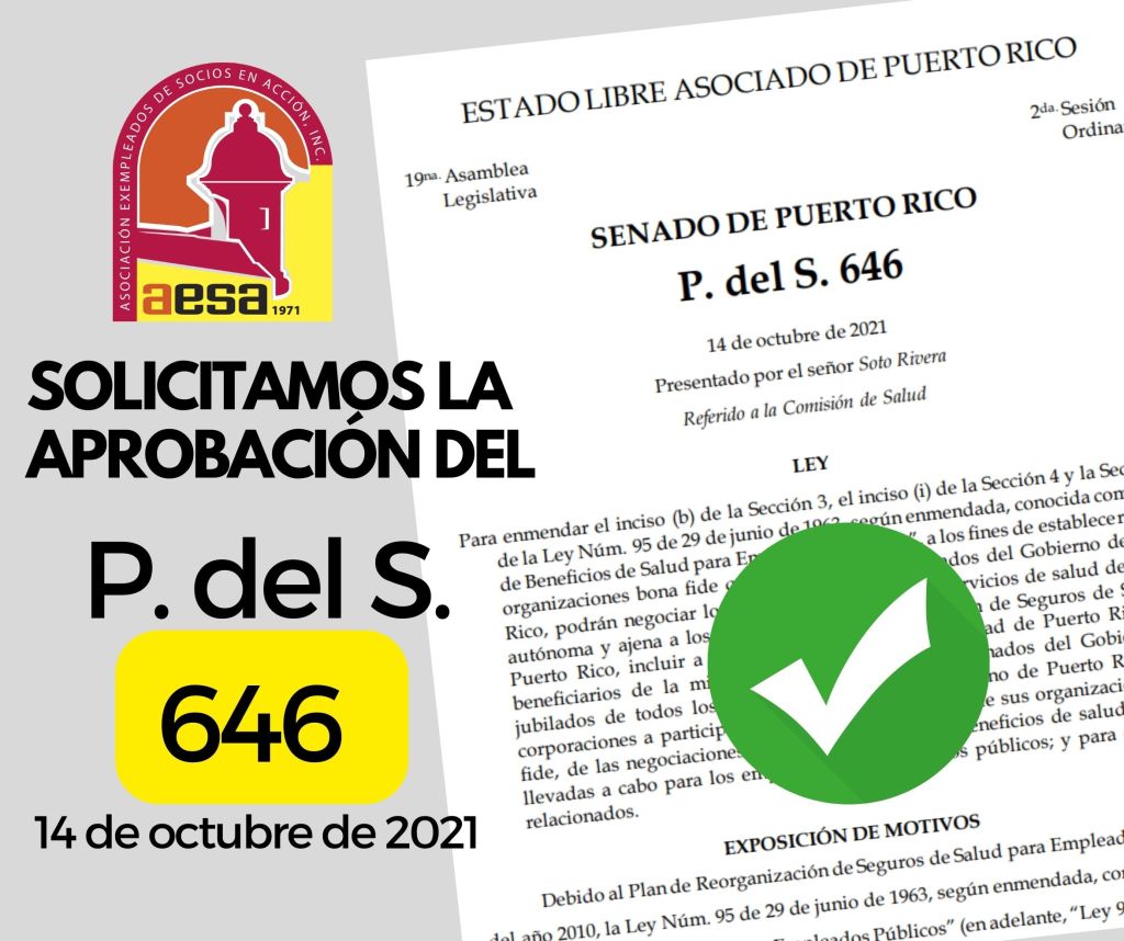 Representantes de la Asociación Exempleados de Socios en Acción, Inc. (AESA) se dieron cita el pasado martes, 2 de mayo de 2022, donde se llevó a cabo la vista pública en relación con el P del S 646 del 14 de octubre de 2022, en la Sala Miguel A. García Méndez del Senado de Puerto Rico. Es indignante observar la falta de interés y el poco apoyo que recibe esta medida por parte de los senadores que integran la Comisión de Salud del Senado. A la misma solo asistió el autor del proyecto Hon. Rubén Soto Rivera, presidente de dicha Comisión; los deponentes y miembros de organizaciones en apoyo a la medida. El resto de los senadores que componen la Comisión de Salud, no cumplieron con su responsabilidad de velar por los derechos de los pensionados de la UPR y del país. Esto es un recordatorio para todos los pensionados y la población de los adultos mayores para que tomen mejores decisiones en las urnas a la hora de elegir quienes nos representarán.