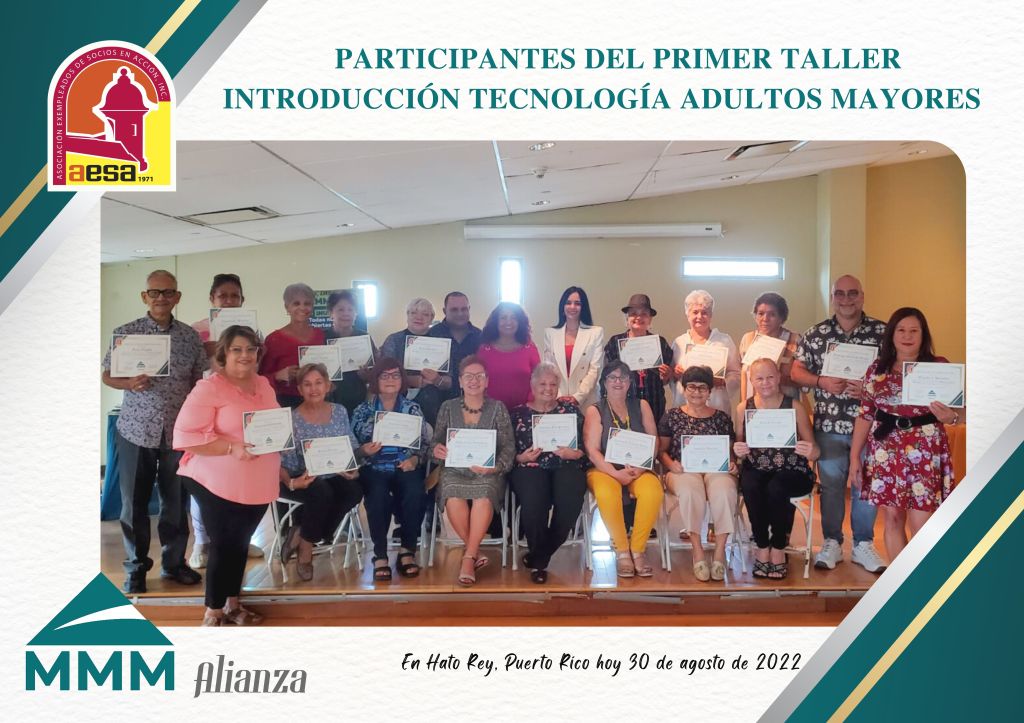 Hoy celebramos el Día de Logros de los participantes del primer taller Introducción a Tecnología para Adultos Mayores, gracias al auspicio de MMM Alianza. El taller fue de doce horas contacto por un periodo de seis días. Durante el taller los participantes, obtuvieron conocimiento básicos en aplicaciones y herramientas de la plataforma de «Google». El taller fue coordinado por la Sra. Eka Cameron y los recursos profesionales encargados transmitir el conocimiento fue el Sr. Victor Rivera, Asesor de Tecnología y Presidente de VicBen Consulting y la Sra. Arlene Marrero, Auxiliar Administrativa de AESA. Finalizamos el curso con la entrega de Certificados de Participación y la presencia de Dayanara Tavárez Lantigua, Ejecutiva de Cuentas de MMM Alianza y su equipo. Agradecemos a Ana Lisette Ayala, Oficial Administrativa de AESA por todo su apoyo en los procesos de coordinación.