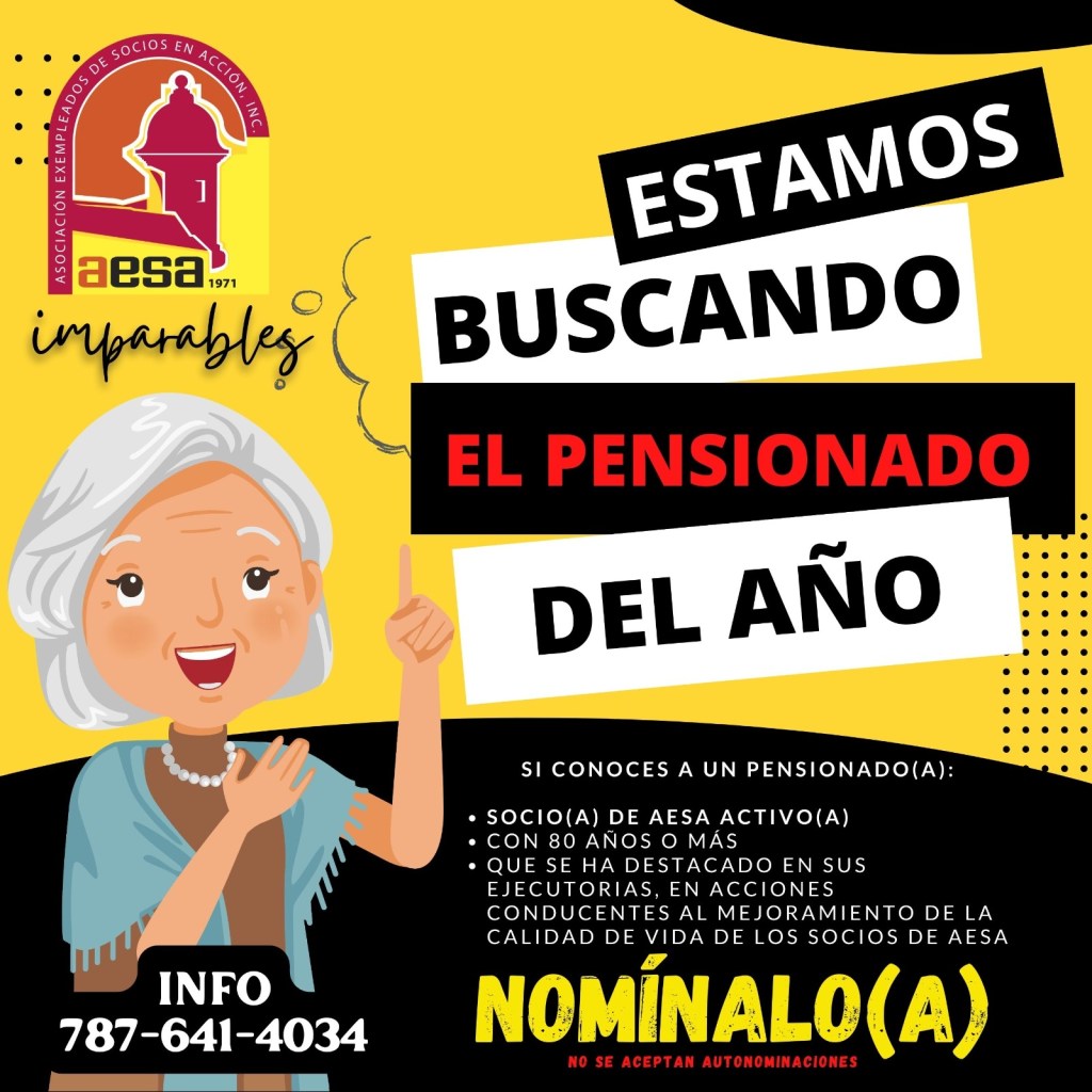 La Asociación Exempleados de Socios en Acción, Inc. (AESA), está en busca del Pensionado del Año. Si conoces a un socio de AESA que tenga 80 años o más, que consideres haya tenido una trayectoria de liderazgo y servicio, NOMÍNALO!!!