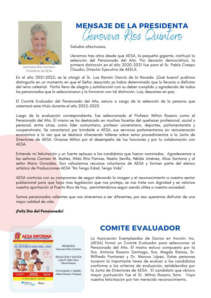 AESA INFORMA Edición 17 – 2022 Publicado porAESA26 octubre, 2022Publicado en Noticias Dale un vistazo a nuestro Boletín Informativo. Comparte esto:Compartir Haz clic para compartir en Facebook (Se abre en una ventana nueva) Facebook Haz clic para imprimir (Se abre en una ventana nueva) Imprimir Haz clic para enviar un enlace por correo electrónico a un amigo (Se abre en una ventana nueva) Correo electrónico Me gusta Cargando... Relacionado