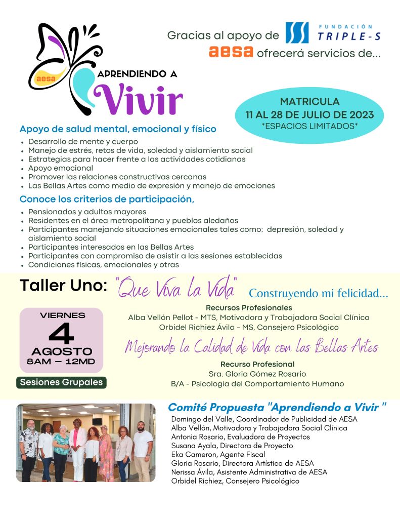 Gracias al apoyo de la Fundación Triple S, la Asociación Exempleados de Socios en Acción, Inc. (AESA) se enorgullece de anunciar el inicio de la serie de talleres bajo la propuesta «Aprendiendo a Vivir Manejando la Calidad de Vida del Adulto Mayor a través de la Salud Integral. El primer taller «Que Viva la Vida» y «Mejorando la Calidad de Vida con las Bellas Artes» será el próximo viernes, 4 de agosto de 2023 de 8:00 a.m. a 12:00 p.m. Les invitamos a matrícularse llamando a nuestra oficina al 787-641-4034, de lunes a viernes de 8:00 a.m. a 4:00 p.m.